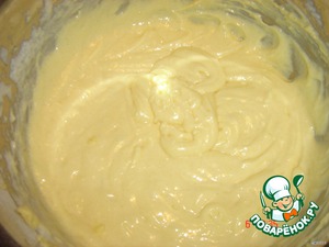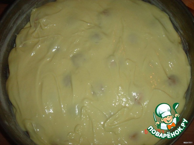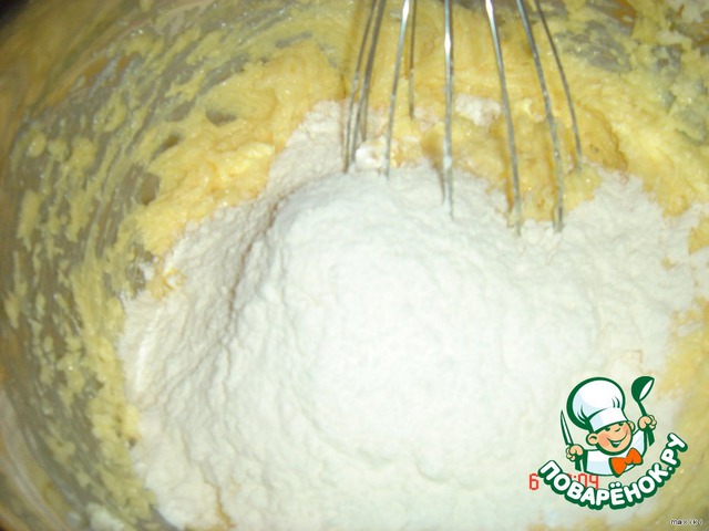 В муку добавить разрыхлитель и замешать не густое тесто.