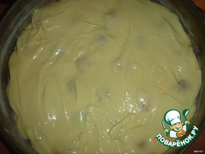 Ввести взбитые белки в тесто и аккуратно перемешать. В смазанную маслом и присыпанную мукой форму выложить половину теста.