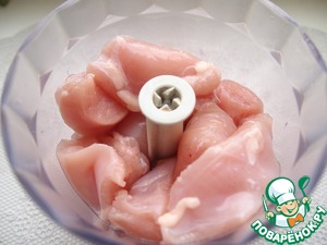 Куриную грудку помыть, порезать на кусочки и отправить в блендер.
