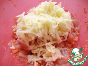 Затем добавить морковь, натертую на мелкой терке. Перемешать.