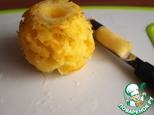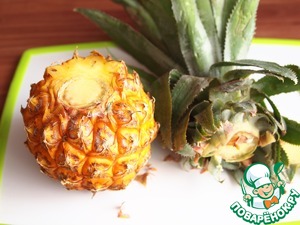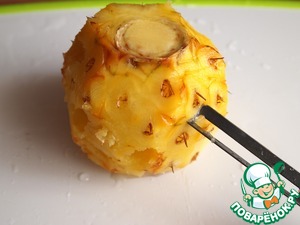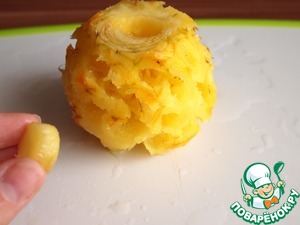 Отрезать от сердцевины маленький кусочек и закрыть им основание ананаса (для того, чтобы не выливался конфитюр, который мы положим в сердцевину).