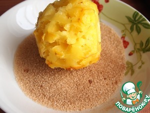 Смешать сахар с корицей и хорошенько обвалять ананас.