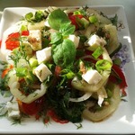 Перец - полосками, лук - кольцами, фету - крупными кубиками. -