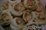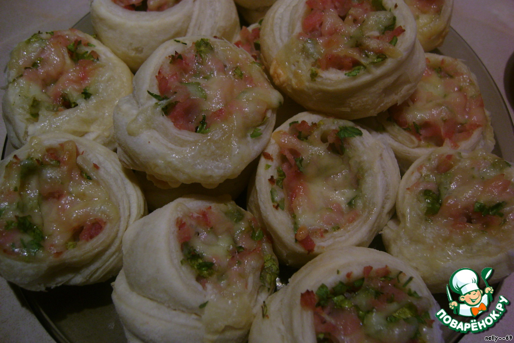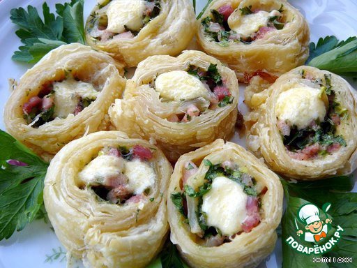Очень мне понравилось! Можно делать с любой начинкой. Берем слоеное тесто, раскатываем, смазываем майонезом, кладем мелко порезанное любое мясо, зелень, тертый сыр. Сворачиваем рулет, режем на кусочки и выкладываем на противень! Через 15 мин. очень вкусная закуска готова!
