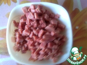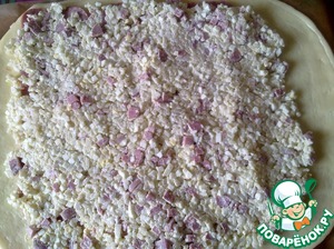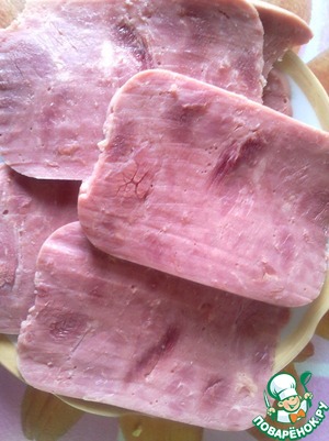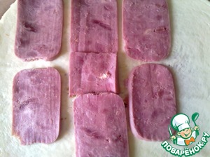 После чего сыр выньте и положите на пищевую пленку, накрыть вторым слоем плёнки и еще тёплым раскатать сыр скалкой в тонкий пласт. На раскатанный сыр уложите кусочки ветчины.