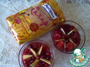 Яблоко нарезать дольками, ягоды (у меня замороженные клюква и клубника) всё разложить по чашкам. Залить получившейся жидкостью (процеживая через ситечко), так чтобы в чашках жидкость только прикрывала яблоко и ягоды. Поставить чашки для застывания в холодильник.