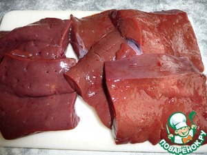Печень очистить от плёнок, прожилок, и нарезать ломтиками толщиной 5-7 мм