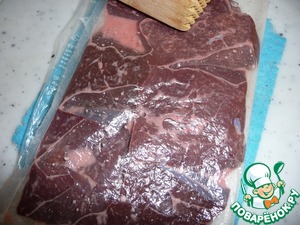 Печень сложить в пакет и отбить с двух сторон, слегка.