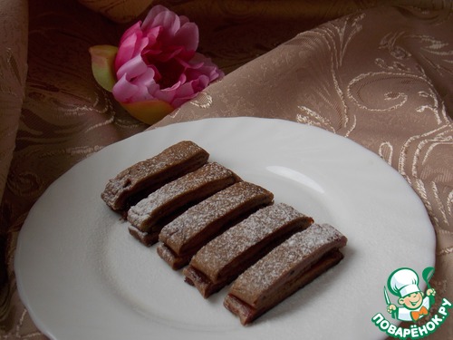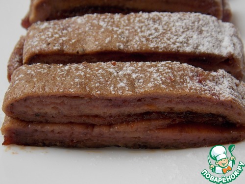 Складываем в несколько слоев. У нас получается длинный прямоугольник. Затем смазываем конфитюром по всей длине и складываем пополам. Оставляем до полного остывания.
