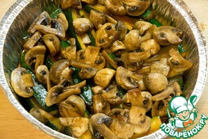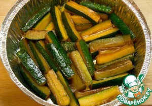 Цукини нарезать продольными кусочками. Обжарить на масле с добавлением соевого соуса для жарки. Он имеет сладковатый вкус — то, что надо.