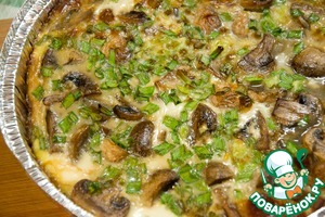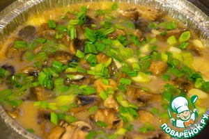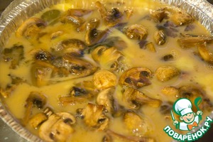 Приготовим омлет. Смешать яйца, сахарную пудру, воду, соевый соус. Если от грибов осталась жидкость — можно добавить.