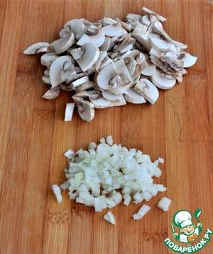 Шампиньоны помыть, обсушить. Лук репчатый очистить, помыть, мелко нарезать. Обжарить на оливковом масле сначала лук до золотистости, раздавить зубчик чеснока. Добавить грибы, обжаривать грибы, пока не уйдет лишняя влага. Чеснок выбросить.