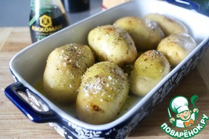 Разогреть духовку до 200С. Картофель наколоть вилкой в нескольких местах и уложить в жаропрочную форму, добавить оливковое масло, столовую ложку соевого соуса, свежемолотый черный перец и соль по вкусу. Хорошо перемешать, чтобы картофель был полностью покрыт маслом.