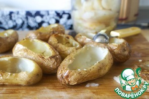 Далее, выбранную мякоть можно превратить в пюре, добавив, например, молоко, яйцо и тертый сыр или просто разбавив водой. Начинить картофель полученным пюре через кондитерскую насадку и зарумянить в духовке. Получится очень красиво и вкусно. Но я предлагаю пойти еще дальше.