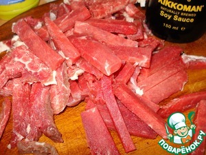 Разогреваем сильно вок, вливаем масло и накаливаем его до дымка. Обжариваем мясо небольшими порциями буквально 1-2 минуты. Огонь должен быть максимальный! Обжаренное мясо перекладываем на тарелку.