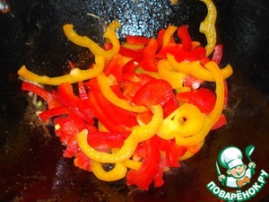 Когда мясо обжарилось, жарим перец. Не более 2 минут, тоже выкладываем на тарелку.