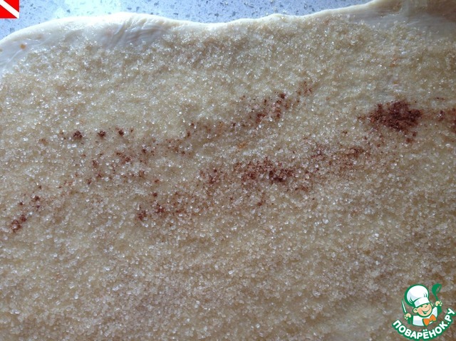 Смазываем размягченным сливочным маслом, посыпаем сахаром (140г) и корицей.