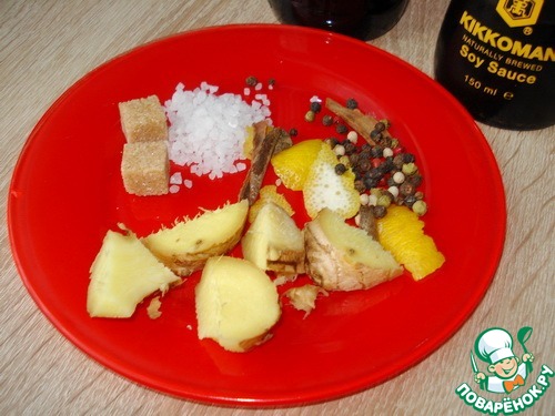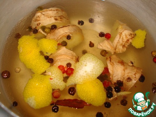 В кастрюлю нальем 0,7 литра воды, добавим цедру лимона, смесь перцев горошком, имбирь, соль, коричневый сахар. Прокипятим 5 минут. Оставим остывать.
