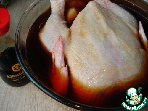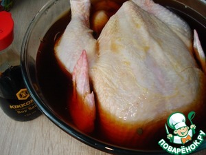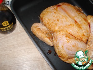 Курицу достать, обсушить, связать ножки и покрыть её получившимся соусом со всех сторон.