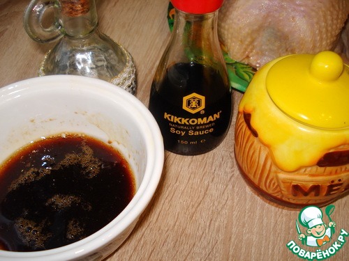 Для глазури понадобиться 1 ст. ложка меда, 1 ст. ложка соевого соуса Kikkoman и 1 ст. ложка оливкового мала.