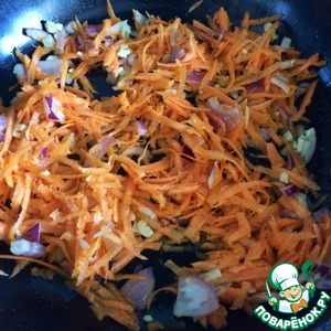 В это время трем морковь на крупной терке и добавляем в сковороду.