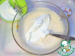 Осторожно смешать все смеси. Взбитые белки кладите в последнюю очередь и понемногу, тихонько вмешивайте в фруктовую массу.
