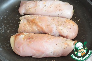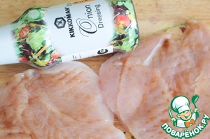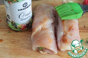 Куриное филе разрезать вдоль и отбить под пленкой с одной стороны. Смазать филе луковым соусом от Киккоман.
