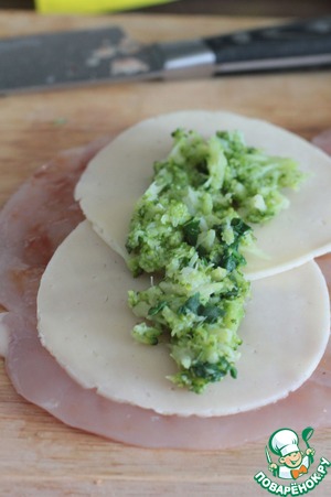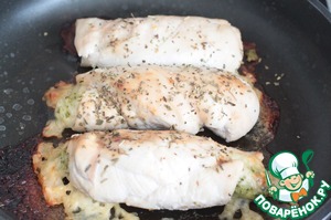На филе выкладываем сыр, сверху пюре из брокколи.