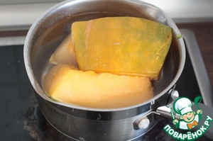 Пока готовится курица, приготовим гарнир. Тыкву разрежем, положим в кастрюлю и доведем до кипения.
