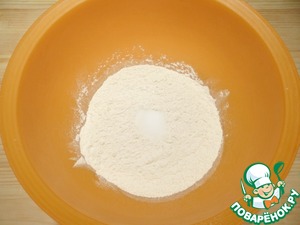Сразу оговорюсь, что я готовила сразу 2 пирога, т. е. брала двойную порцию ингредиентов. Готовлю обычное песочное тесто. Муку просеиваю, добавляю соль, перемешиваю.