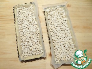 Выкладываю тесто в формы (бортики лучше поднимать повыше, чтобы потом поместилось побольше сметанно-яичной заливки. Накрываю тесто пергаментом, насыпаю горох, фасоль или специальные керамические шарики и выпекаю тесто в разогретой до 180 градусов духовке около 12 минут. Затем пергамент и фасоль убираю, выпекаю еще 3 минуты.