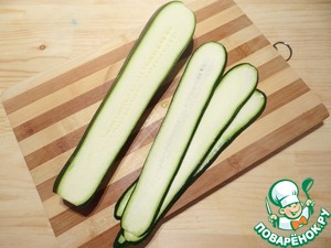 Подготавливаю овощи для пирога. Кабачок мою и нарезаю ножом для чистки овощей (или ножом для нарезки капусты с двойным лезвием) тонкими длинными ломтиками. Сворачиваю ломтики кабачка, на время скрепляю зубочисткой. Если ломтики у Вас получаются очень тонкие, можно сворачивать по 2 ломтика. Низ каждого "цветка" чуть подрезаю так, чтобы все они были примерно одинаковой высоты.