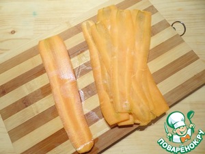 "Цветы" из моркови за время выпечки пирога не успевают стать мягкими, поэтому морковь нужно отварить до полуготовности, очистить, тоже нарезать тонкими длинными ломтиками, свернуть и скрепить зубочисткой на время.