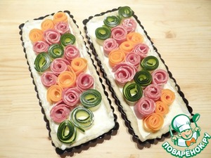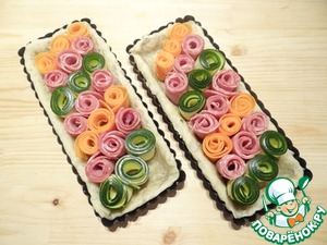 Из тонко нарезанной ветчины тоже сворачиваю "цветы". Выкладываю подготовленные "цветы" из кабачка, моркови (удалив зубочистки) и ветчины на тесто в следующем порядке - кабачки-ветчина-морк овь-ветчина и т. д. Для того, чтобы все "цветы" были одной высоты, возможно, надо будет их немного подрезать снизу.