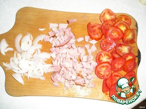 Режем небольшими кусочками балык. Полукольцами - лук. Кружочками - помидоры.