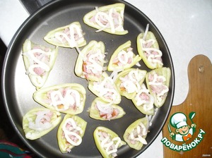 В половинки перчиков выкладываем балык, затем лук. И слегка покрываем майонезом.
