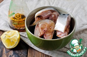 Скумбрию выпотрошить, промыть и нарезать кусочками. Уложить ее в миску и замариновать в 2 ст. л. слабосоленого соевого соуса Kikoman. -