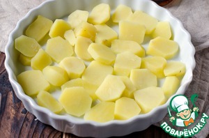 Картофель очистить и отварить, нарезать на кружочки и отварить в подсоленной воде в течение 5-7 минут. Уложить картофель в жаропрочную форму, смазанную маслом.