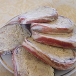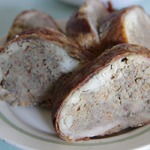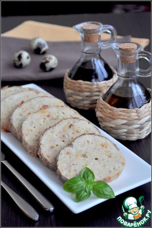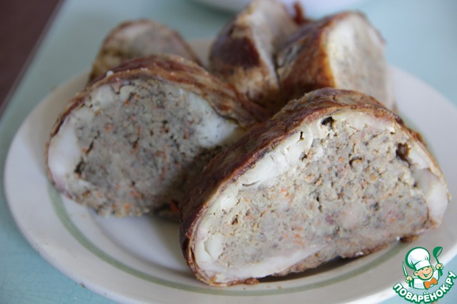 Плотно завернуть фольгу, переложить в форму для запекания, налить воды 1 см. Запекать при 190* 1,5 часа. За 15 минут до окончания приготовления развернуть фольгу и дать рулету чуть зарумяниться. Достать рулет из духовки, полностью остудить, нарезать толщиной 1см.