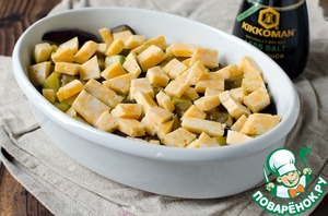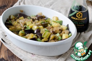 Кабачки и баклажаны вымыть и нарезать кубиками. Лук и чеснок очистить и мелко нарезать. Обжарить овощи на разогретой с растительным маслом сковороде до мягкости, в конце влить 3 ст. л. соевого соуса Kikoman.