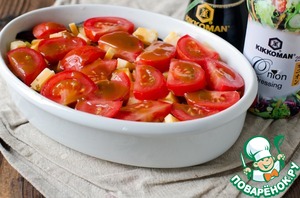 Помидоры нарезать ломтиками, уложить их на сыр и полить салатным соусом Kikoman с луком.