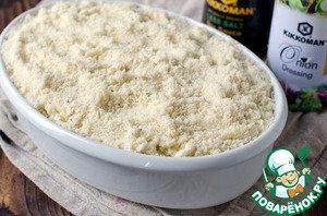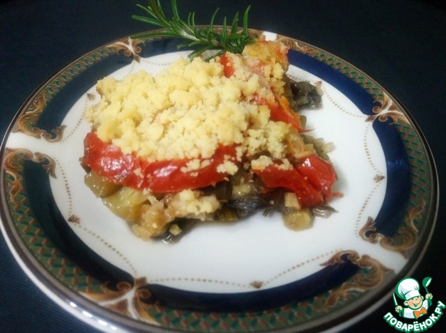 Муку поместить в чашу процессора, добавить охлажденное масло, нарезанное кубиками, и измельчить в импульсном режиме, чтобы получилась крошка. Выложить ее на овощи.