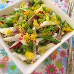 Яйца порезать кубиком, посолить и поперчить. Смешать масло, сахар и уксус и заправить салат, все аккуратно перемешать и порционно выложить.