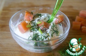 Для соуса нарезать лосось на мелкие кубики, измельчить зелень и перемешать со сметаной, приправленной черным перцем и лимонным соком по вкусу.