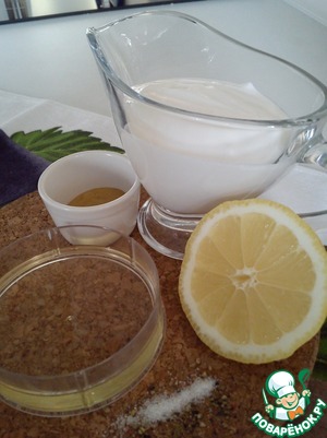 Смешиваем до однородной массы масло, лимонный сок, горчицу, соль, перец.