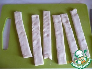 Разрезаем, размороженное при комнатной температуре, тесто на полоски.