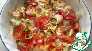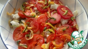 Далее выкладываем помидоры (кружками) и болгарский перец (соломкой)