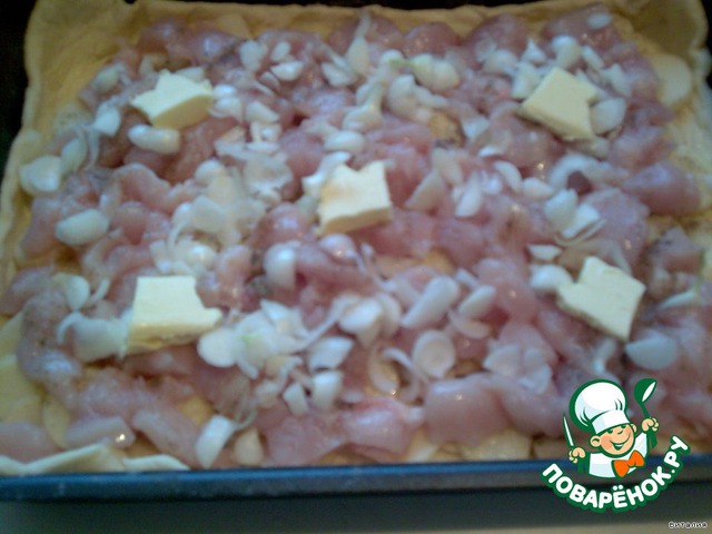 1 пласт теста раскатать, форму смазать маслом и уложить в нее пласт. Сегодня я сделала в форме с высокими краями, но лучше делать на противне, краешки пирога получаются хрустящими и поджаристыми.