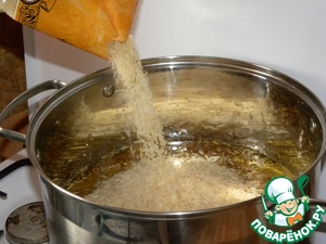 Засыпаем рис и распределяем его так, чтобы он равномерно погрузился в зирвак.