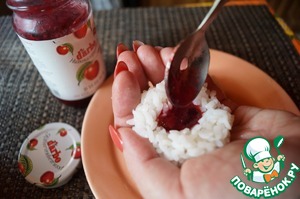 Влажными руками формируем из риса шарики, делаем в них углубление, кладём у углубление конфитюр (без жидкости, у меня низкокалорийный вишнёвый D’arbo)...